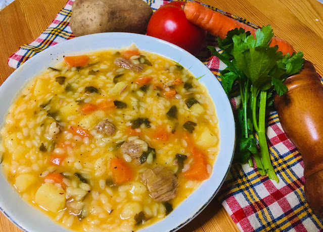 - Μόλις είναι έτοιμο το βγάζουμε και ρίχνουμε στην κατσαρόλα 1 πατάτα, 1 καρότο 1 κρεμμύδι και την ντομάτα ξεφλουδισμενη, ολόκληρα.