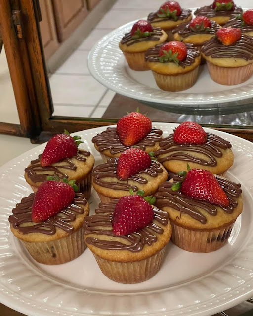 - Περιχύνουμε με λιωμένη σοκολάτα γάλακτος και στολίζουμε με μισή φράουλα.